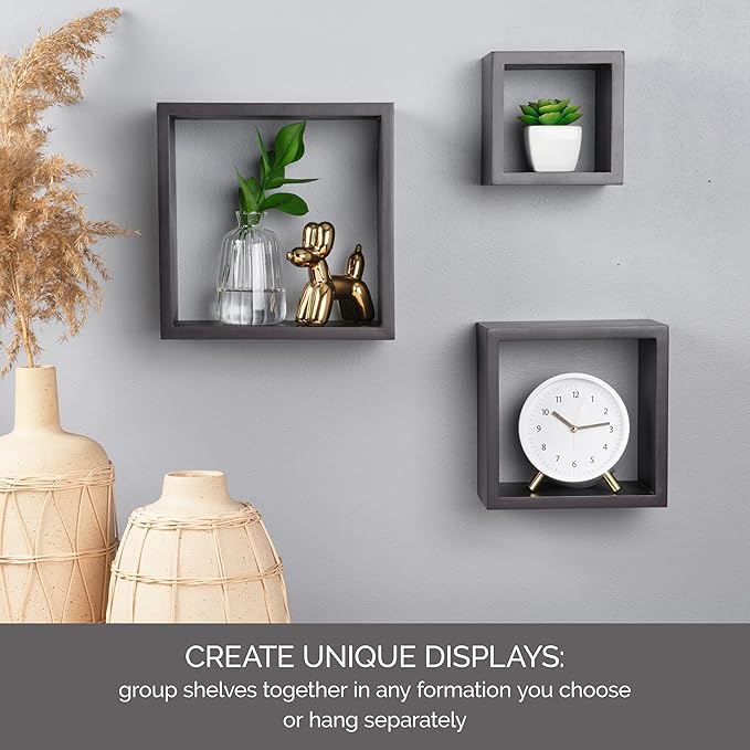 - SET OF 3 SQUARE SHELVES: This set includes 3 square shelves; 1 small, 1 medium, and 1 large.