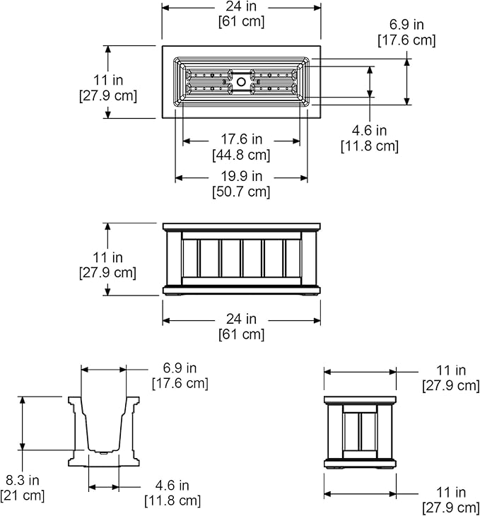 - Outside Dimensions: 24in L x 11in W x 11in D; Inside Dimensions: 19.5in L x 6.25in W x 8.5in D; Footprint: 24in x 11in; Capacity: Approximately 2.2 gallons (8.3 liters) Water reservoir capacity and 3.5 gallons (13.2 liters) of soil capacity