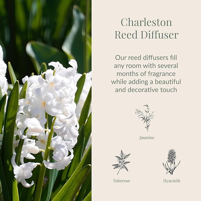 - Archipelago Botanicals Charleston Reed Diffuser. The reed diffuser features a distinctive blend of Jasmine, Tuberose, and Hyacinth. The diffuser set includes fragrance oil, an elegant, frosted glass vessel and 10 natural diffuser reeds.