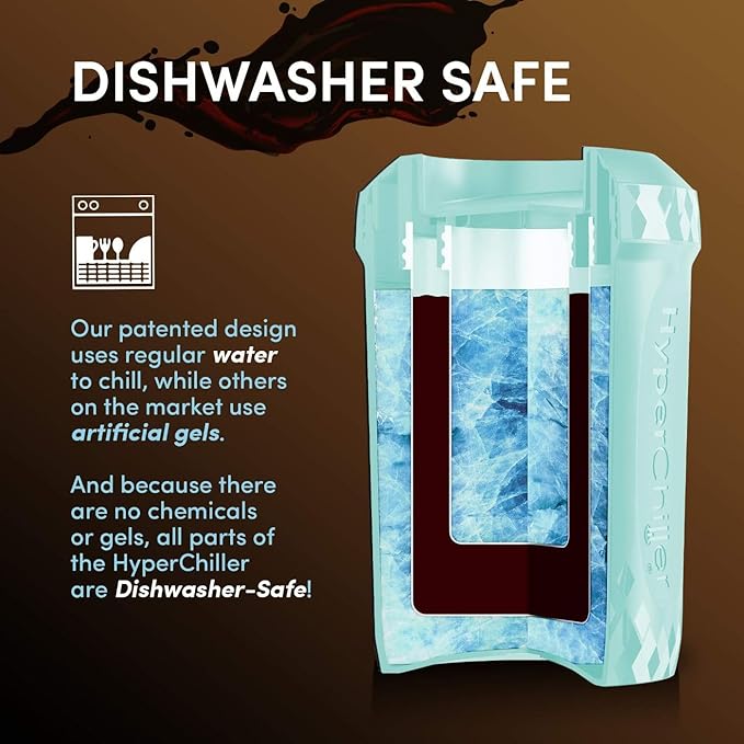 - IMPROVED V2 PRODUCT - the easiest, most cost effective way to chill your favorite beverages. Our Patented design uses regular water to chill and because there are no chemicals or Gels, all parts of the HyperChiller are dishwasher safe