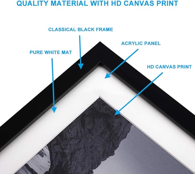- Framed:These canvas are with black frames.There is a thin acrylic panel in the front as a faceplate .And the picture canvas print are inset by the white cardboard .The back is fixed by black flannel and hardboard to complete the wall decor.Each panel has a hook.Ready to hang