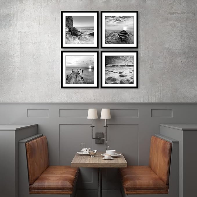 ENGLANT-4 Panels Set Framed Canvas Print for Seascape Beach and Boat Sunrise Scenery Black and White Giclee Canvas Print Wall Art Ready to Hang