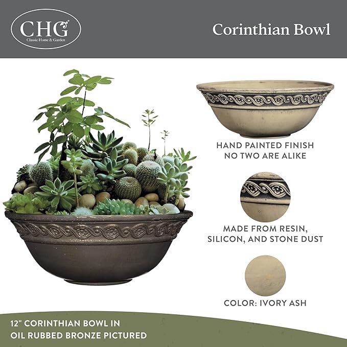 Classic Home and Garden Corinthian Shallow Planter with Drainage - Decorative Garden Bowl Planter for Succulents, Flowers, & More - UV Resistant Wide Plant Bowl for Indoors/Outdoors (12” Ivory Ash)
