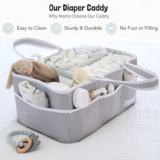 - Stylish & Functional Diaper Caddy Organizer for Boy or Girl Nursery Room - Our diaper tote is designed with adorable style and colors, and is built with quality fabric. It is soft to touch and high standard you would expect, including removable organizing dividers that you can organize diapering essentials such as diapers, wipes, lotions, toys and many more, all in one place.