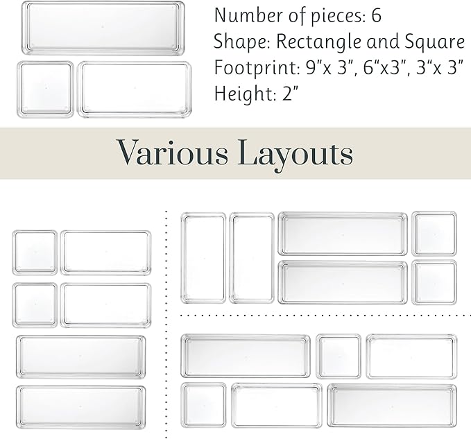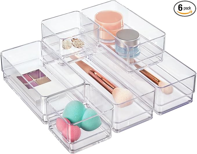 STORi SimpleSort Drawer Organizer Bins 6 pc Set, Multi-size, Bathroom Organizers and Storage, Makeup Organizer, Desk Organizer, Vanity Organizer, Clear Organizing Containers, Made in USA