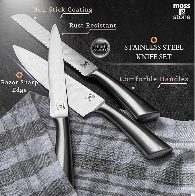- Easy And Fast Slicing: Moss & Stone small stainless steel kitchen knife set will make your daily use of cutting, chopping, slicing, and dicing much easier and faster, emphasizing your safety to prevent work accidents. The small knife set stainless steel is easy and fast to clean with a simple hand wash.
