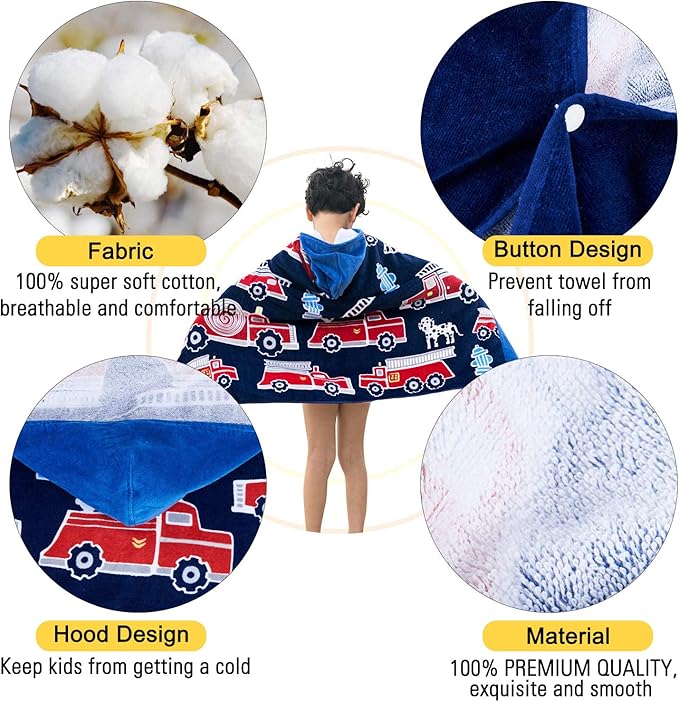 - ?Design & Theme?With buttons on front of the soft bath towel, adjustable and more convenient for kids to put on and off. Hooded design on beach towel to prevent children from catching cold. Fun themed designs and vibrant colors add even more fun for kids at the beach and in the bath.