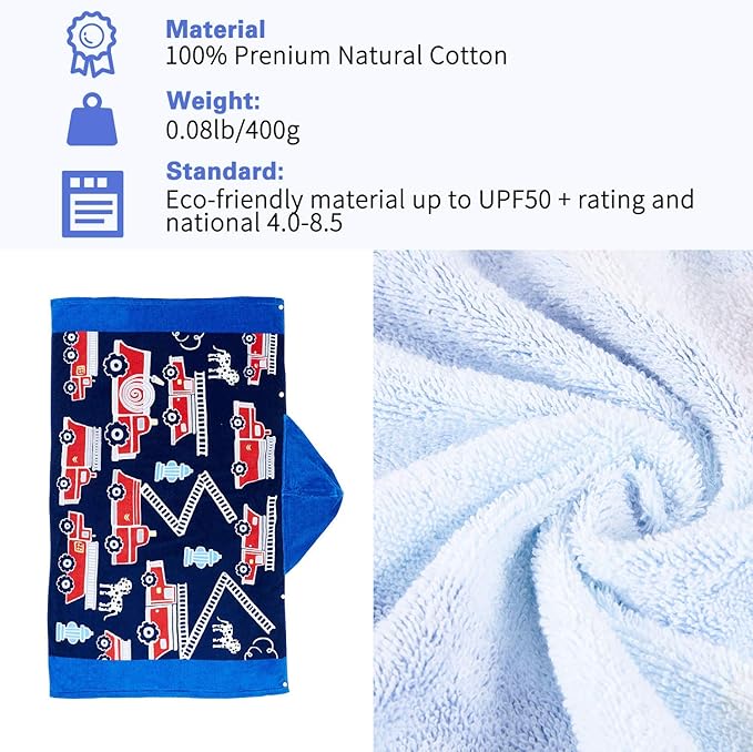 - ?Premium Material 100% Cotton ?Wowelife bath towel is made of 100% cotton, the quick dry beach towel is soft and breathable. Children with delicate skin can also be used with complete confidence. High quality fabric increases the durability of the toddler bath towel. Fade-resistant & no lint, eco-friendly material of UPF50+ rating and national 4.0-8.5 standard.