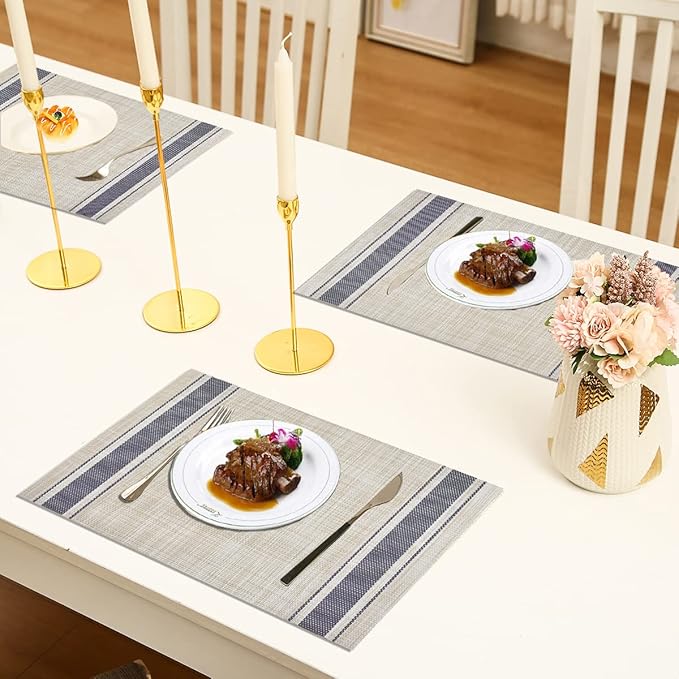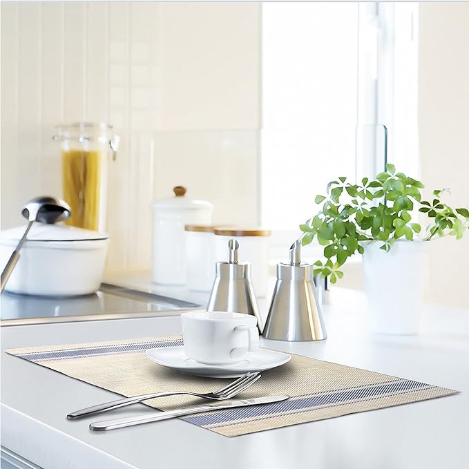 DACHUI Placemats Set of 4, Soft & Elegant Woven Vinyl Place Mats, Water Resistant, Heat Resistant, Washable, Durable Table Mats (Blue Stripes)