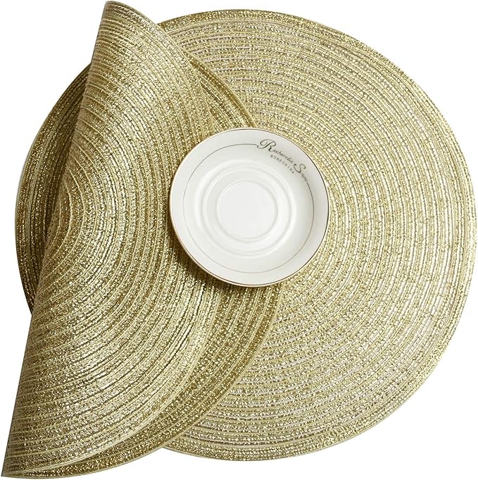 SHACOS Golden Glitter Round Braided Placemats Set of 6 Bling Circle Place Mats Washable Table Mats for Holiday Party Wedding Shower (6, Gold)