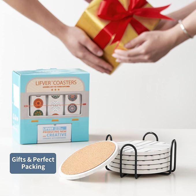 Lifver 6 Piece Absorbent Stone Coaster Set with Holder,Drink Spills Coasters, Grey-Lines