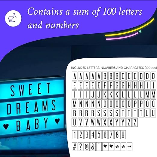 - Personalized Messages: Customize your own messages with ease using the Cinema Light Box, featuring 100 LED light letters and numbers that can be effortlessly rearranged for eye-catching displays.