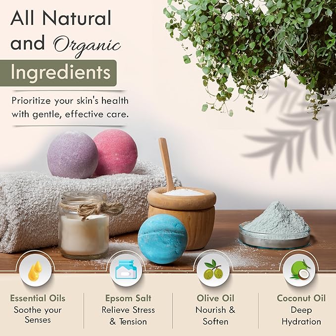 - All Natural And Organic Ingredients : Using the cleanest natural ingredients Essential Oils , Epson Salt , Coconut Oil, and Olive Oil. Each bath bomb is infused with high quality clean essential oils.