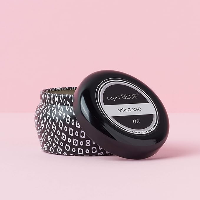Capri Blue Volcano Scented Mini Tin Jar Candle - Printed Mini Tin Candles for Home Scented with Tropical Fruit & Sugared Citrus - Long Lasting Soy Wax Blend - Black (3 oz)
