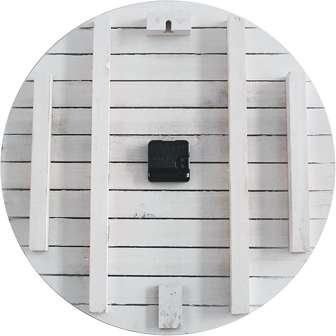 - IT'S IN THE DETAILS - Our round White Shiplap Farmhouse Wall Clock has a painted white finish and is made of wood with metal hands. Each wood product is unique with variations in grain, color and finish from natural and handcrafted characteristics