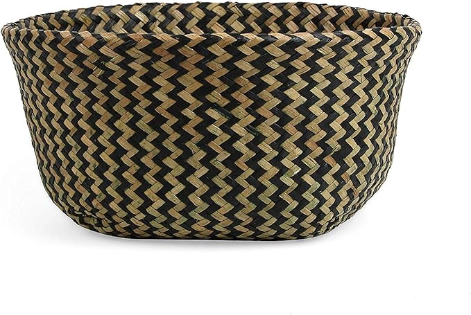 Woven Seagrass Belly Basket for Storage Plant Pot Basket and Laundry, Picnic and Grocery Basket (Large, Black Strips)