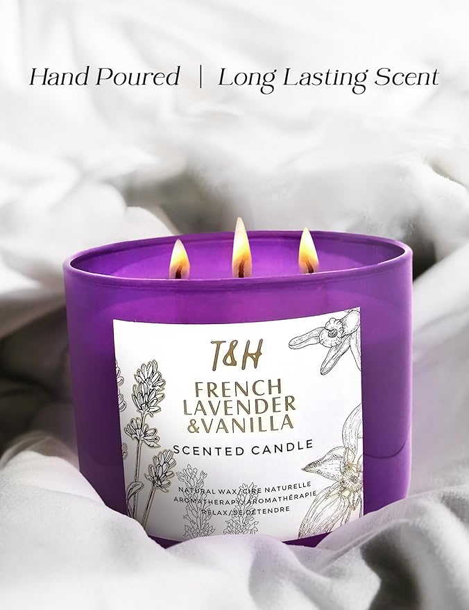 - 🕯️ Refreshing 3 Wick Scented Candle: Immerse yourself in the soothing aroma of our Lavender Vanilla 3 wick aromatherapy candle, infused with notes of Lavender, Vanilla, Jasmine, Eucalyptus, Sandalwood, and Amber essential oils. This tranquil blend opens with soothing floral tones and soft aromatic layers, unfolding into a warm, comforting finish. The result is a serene, balanced scent that feels both calming and gently uplifting. This 15.8 oz 3 wick soy candle is designed to soothe your senses and elevate any space, perfect for your home, kitchen, bathroom, or office.