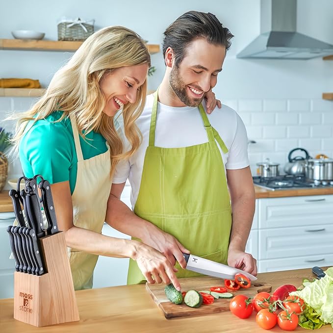 - Easy To Clean Knives: The wooden knife block set is easy to clean and dishwasher safe. A perfect & cheap 14-piece cooking knives set! Customer Support: Moss & Stone knife cutlery wooden block set is covered under our 1-year warranty for our kitchen knife sets!
