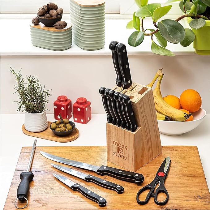 Moss & Stone 14-piece Knife Block Set, Stainless Steel Knife Set, Premium Kitchen knives Set With High-Carbon Stainless Steel Blades And Wooden Block Set, Cutlery Knife Set, 14 Pcs Kitchen Knife Set