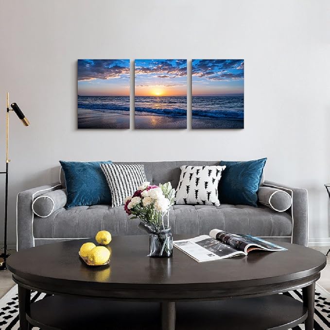 Framed Canvas Wall Art for living room Large Size Office Wall Decor Sunrise blue sea view Wall Pictures Artwork ocean Paintings Ready to Hang for Modern bedroom Home Decoration 16" x 24" 3 Pieces