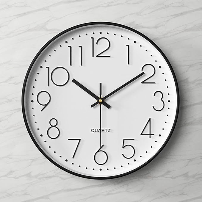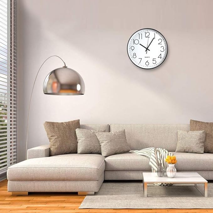 - Size: 12" in dia. x 1.5" thick. Modern and simple wall clock for living room, bathroom, bedroom, kitchen, office wall decor.