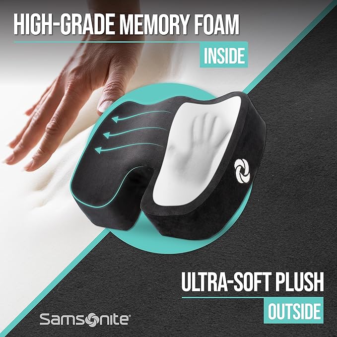 - HIGH-GRADE MEMORY FOAM - This seat cushion from Samsonite is stuffed with the best memory foam on the market. This foam reacts immediately to the precise shapes and curvatures of your body to offer lower back and upper leg support customized just for you. It remembers the shape of your body, so you can rely on it to adjust right back to the perfect form for you the moment you start using it.