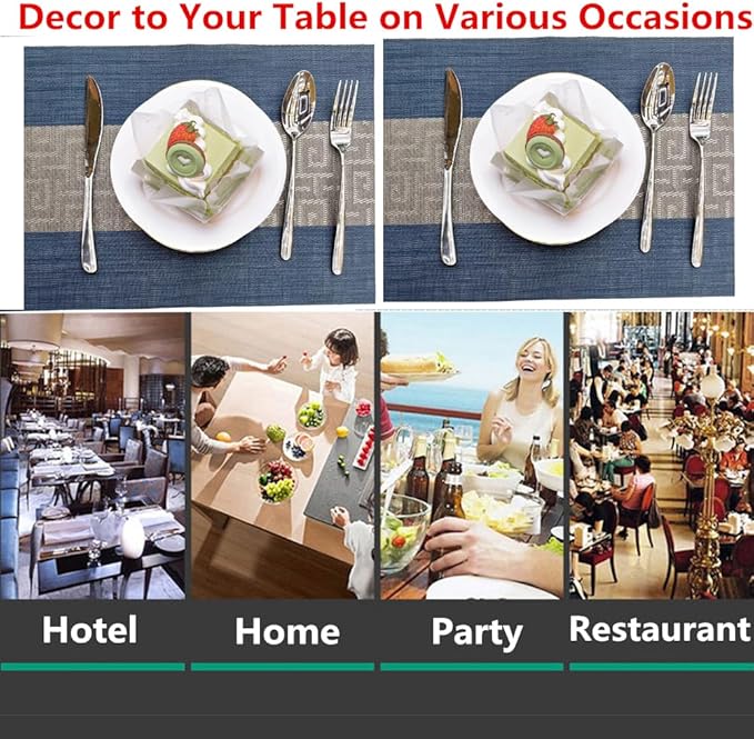 - Widely Used: Stylish placemats will be a good decor and quality of life for your home, dorm, restaurant, kitchen, hotel and office. place mats great for outdoor and indoor activities, such as BBQ, picnic, beach, boat and so on, meet your different needs