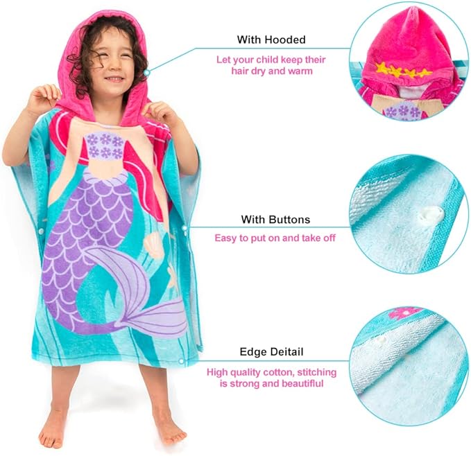 - ???FRIENDLY DESIGN??: Our bath & hooded towel has two snaps on the side to help you wrap your child up.This surf poncho is easy to put on and off, and will not slide down from body.The hood can helps dry your child's hair and prevent children from catching a cold.