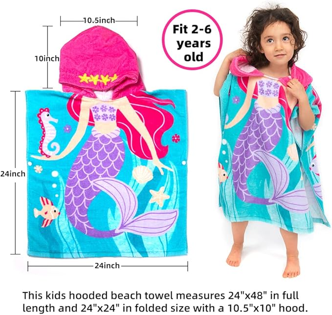 - ???KIDS TOWEL SIZE??: This kids hooded beach towel measures 24"x48" in full length and 24"x24" in folded size with a 10.5"x10" hood, which is large enough for both kids and growing toddlers aged from 2 to 6 .