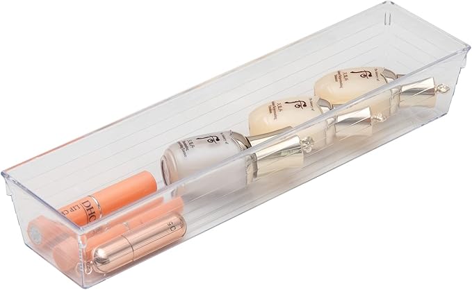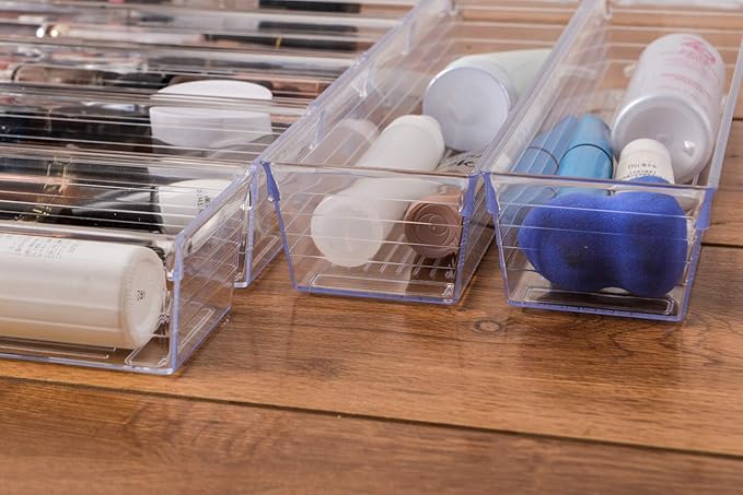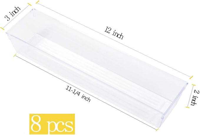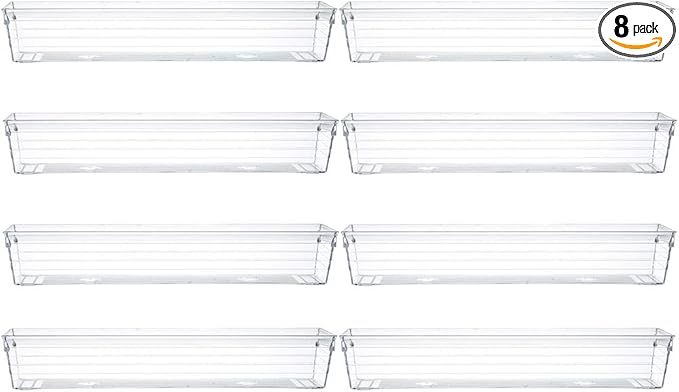 Backerysupply Clear Plastic Drawer Organizer Tray for Vanity Cabinet (12”×3”×2”,Set of 8),Storage Tray for Makeup, Kitchen Utensils, Jewelries, and Gadgets