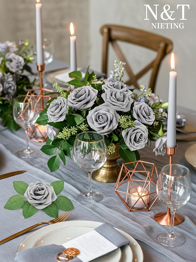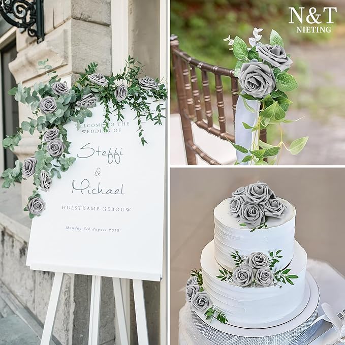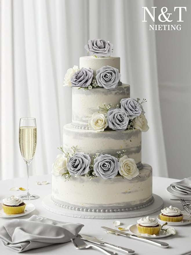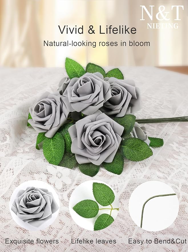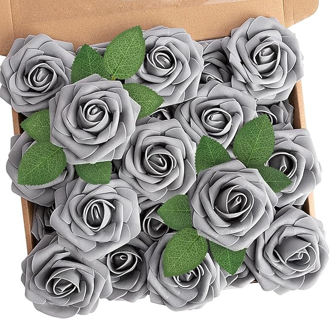 N&T NIETING Artificial Rose, 25pcs Gray Fake Foam Flowers with Stems for Wedding Party Baby Shower Cake Decoration, Home Display