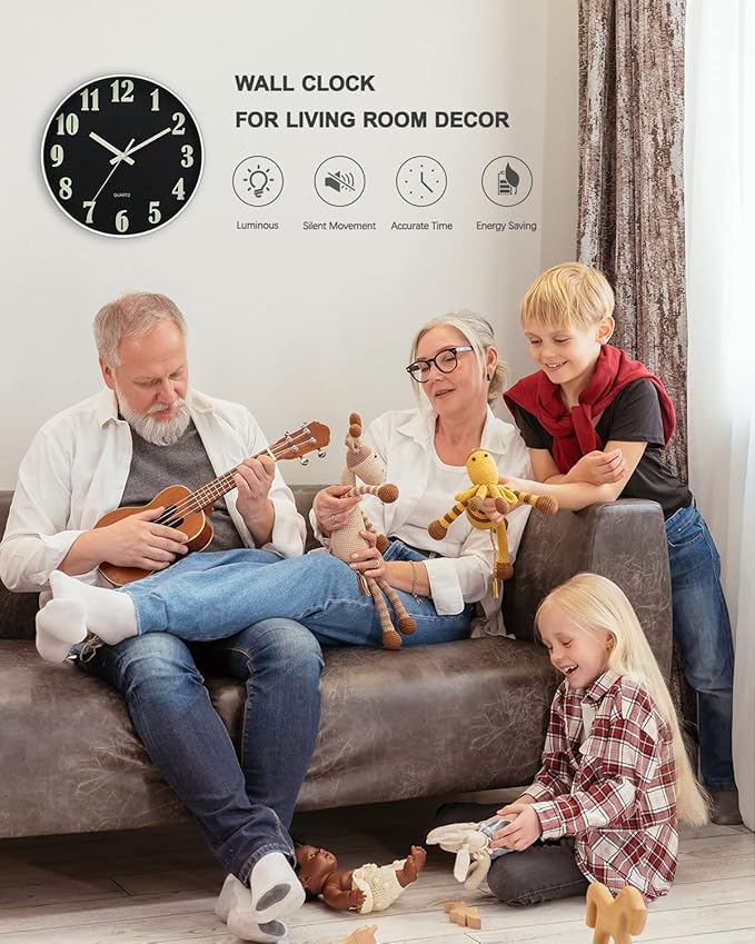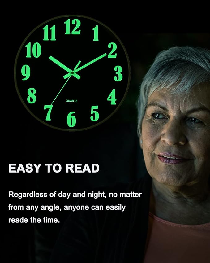 JoFomp Glow in The Dark Clock, 12 Inch Modern Silent Non Ticking Wall Clocks Battery Operated, Night Light Wall Clock for Living Room Decor, Wall Clock Decorative for Kitchen Bedroom