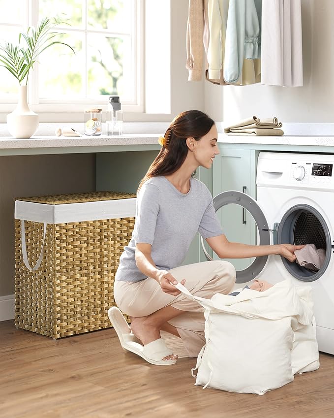 SONGMICS Laundry Hamper with Lid, 110L Clothes Hamper with 2 Removable Liner Bags, 6 Mesh Bags, Wicker Laundry Basket, Double Laundry Hamper for Bathroom, 13 x 22.4 x 23.6 Inches, Natural ULCB52NL