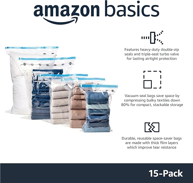 Amazon Basics Vacuum Compression Space Saving Storage Bags with Hand Pump for Clothes Packing, Pack of 15, Multiple Sizes, White