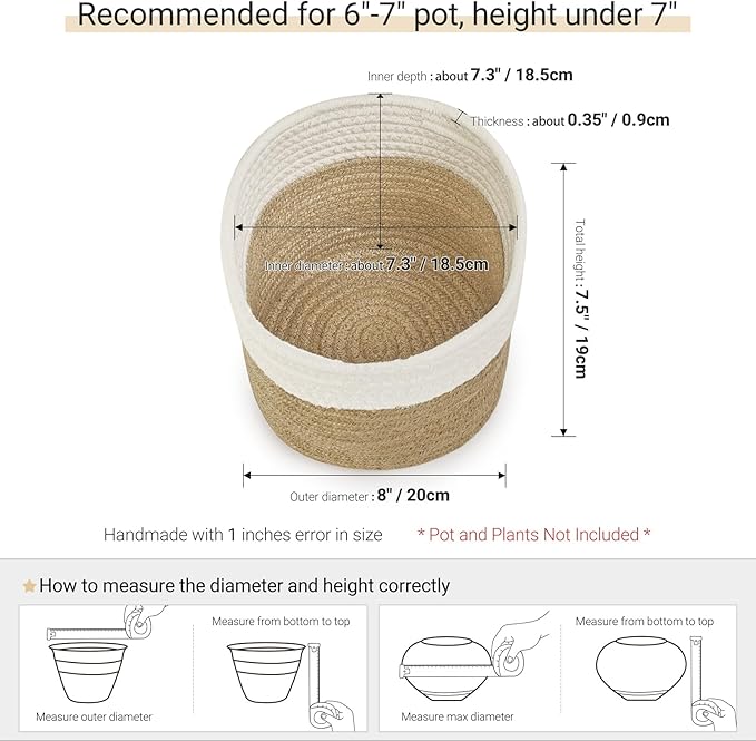 - Adorable Size: This cute cotton rope basket is 8"(W) ×7.5"(H) , fits from 6" up to 7" flower pot. This hand woven basket winding beige bottom and waist adds a stylish touch to your favorite lovely plant for home, offices, and nursery with modern simplicity. The tinny baskets warm up a room,great for your little items,you can store anything small in it. Note: Pot and plants are not included in the basket