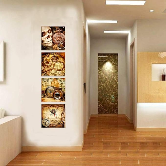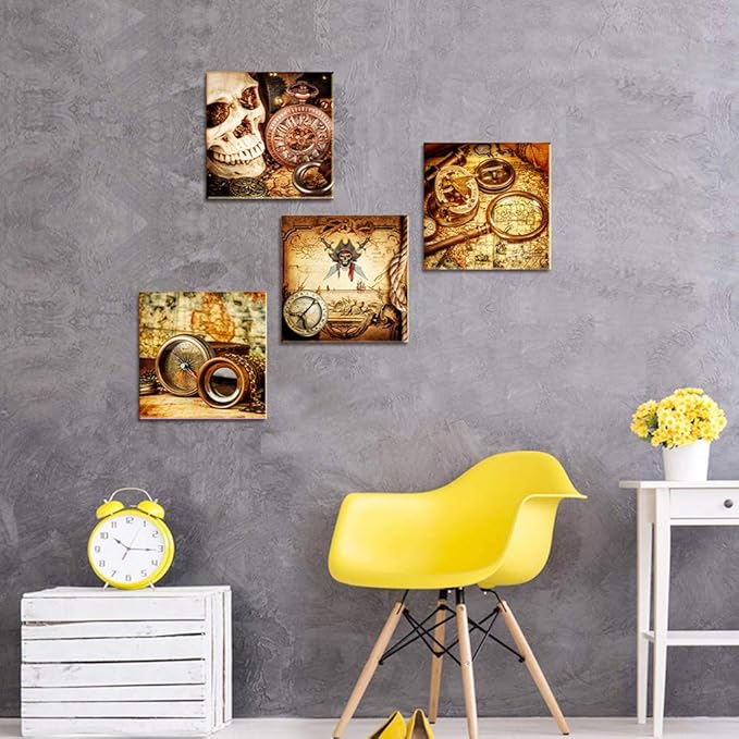 Pirate ship compass Restoring ancient ways Wall Art for living room Canvas Prints Artwork bathroom Wall Decor Watercolor painting 4 Piece Framed bedroom wall decorations Office Home Decoration