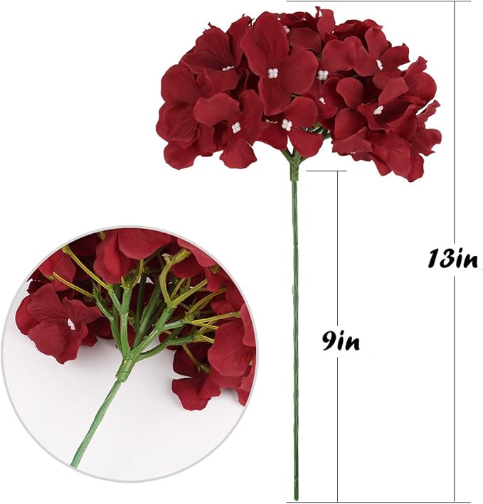 Flojery Silk Hydrangea Heads Artificial Flowers Heads with Stems for Home Wedding Decor,Pack of 10 (Burgundy)