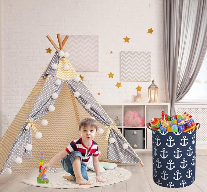 Kids Hamper,Collapsible Laundry Baskets,Waterproof Storage Baskets with Leather Handle,Nautical Decor,Toy Organizer (Navy Blue Anchor)