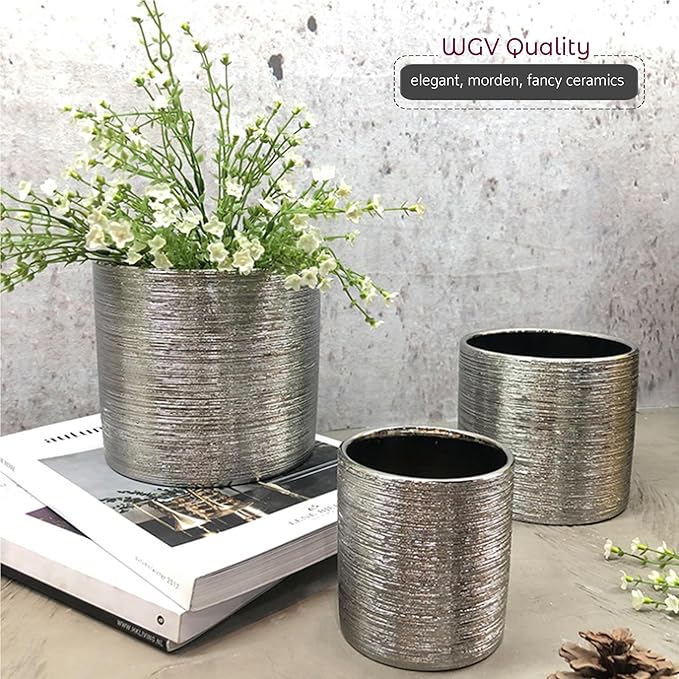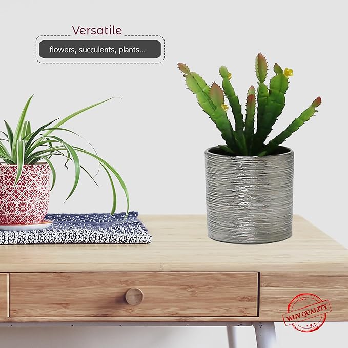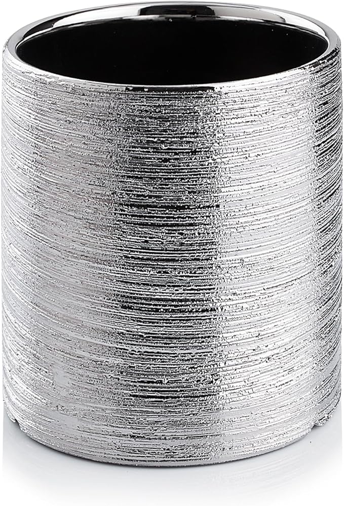 WGVI Silver Etched Ceramic Cylinder Vase Width 3.75" Height 4", Flower Arrangements, Candle Holder, Terrarium Planter Pot, Storage Container Organizer, Pen Brush Holder, Scratched Texture, 1 Piece