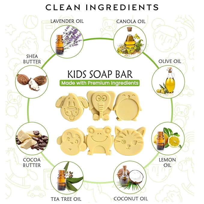 - PREMIUM INGREDIENTS FOR SENSITIVE SKIN: Our handmade soaps for kids are crafted with premium ingredients gentle on sensitive skin. These moisturizing bars provide a luxurious bath experience. Enjoy the natural goodness without harsh additives.