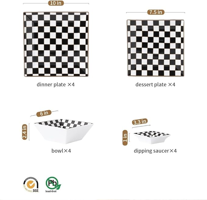Porlien Checker Porcelain Square Dinnerware Set for 4, Dishes Set for 4 with 3.3-inch Dipping Saucers, Black and White Plates and Bowls Set
