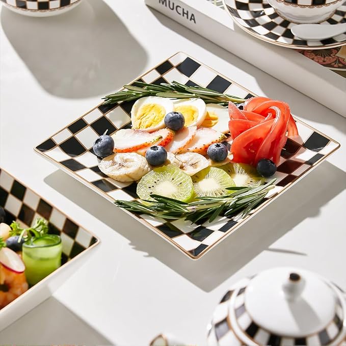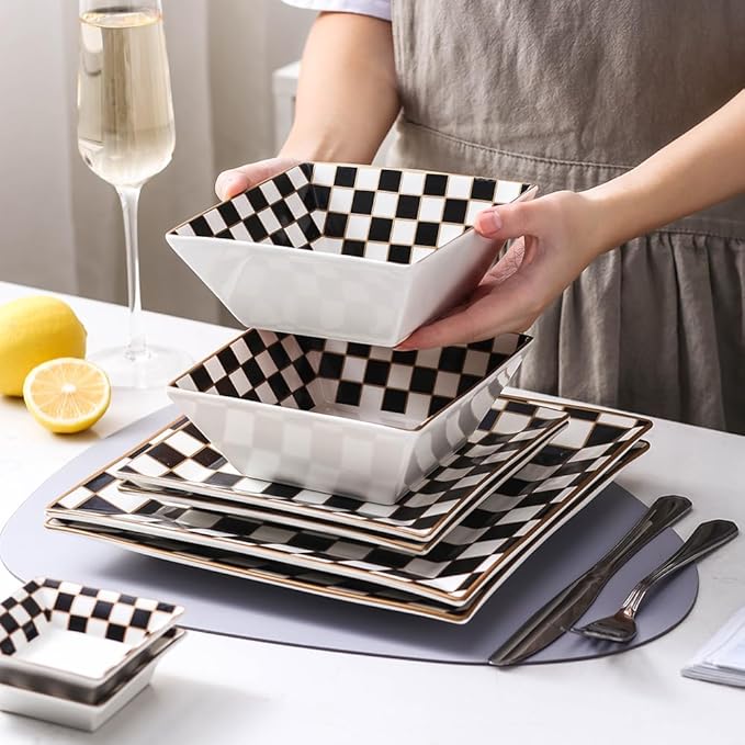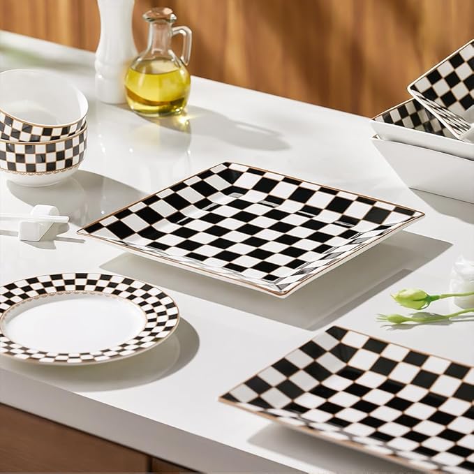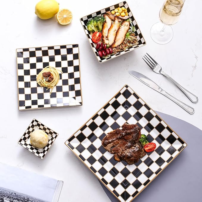 - The dinnerware with classy checker trimmed with dark gold, creating a comtemporary atmosphere and adding a shine to your dinning table