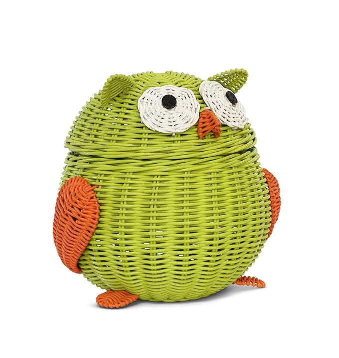 Owl Rattan Storage Basket With Lid Decorative Bin Home Decor Hand Woven Shelf Organizer Cute Handmade Handcrafted Nursery Gift Animal Decoration Artwork Wicker Hoot Owl Green