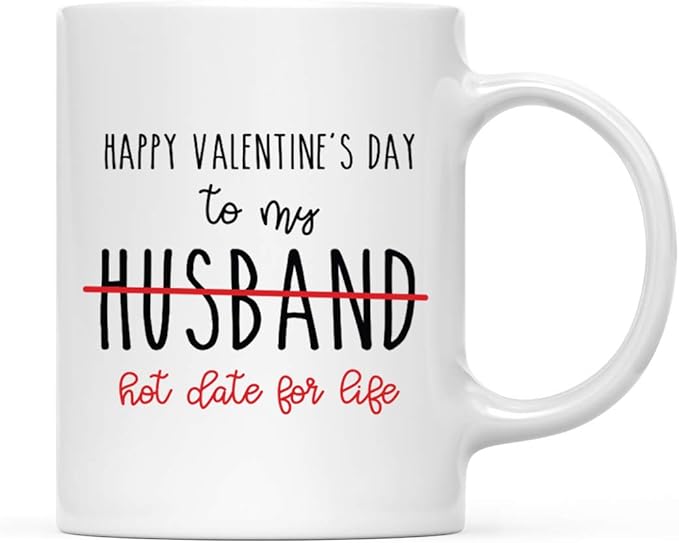 Andaz Press Valentine’s Day Funny 11oz. His Her Couples Coffee Mug Gift, Happy Valentine's Day To My Husband Hot Date For Life, 1-Pack, Gift Box