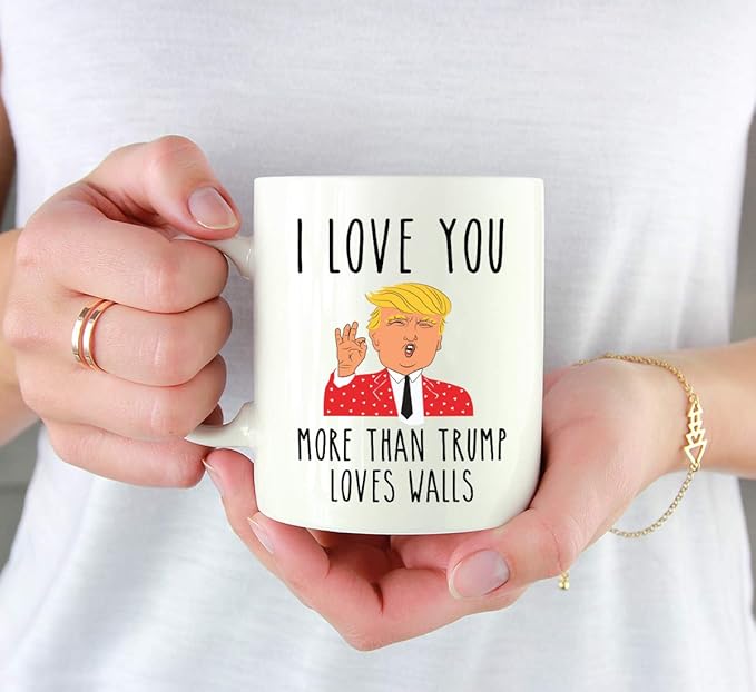 Andaz Press Valentine’s Day Funny 11oz. His Her Couples Coffee Mug Gift, I Love You More Than Trump Loves Walls, Donald Trump Graphic, 1-Pack, Gift Box