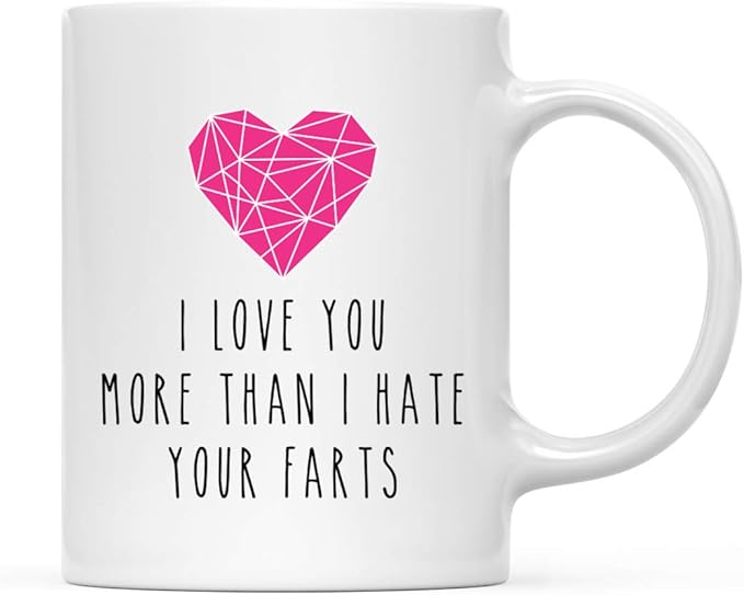 Andaz Press Valentine’s Day Funny 11oz. His Her Couples Coffee Mug Gift, I Love You More Than I Hate Your Farts, Pink Heart Graphic, 1-Pack, Gift Box