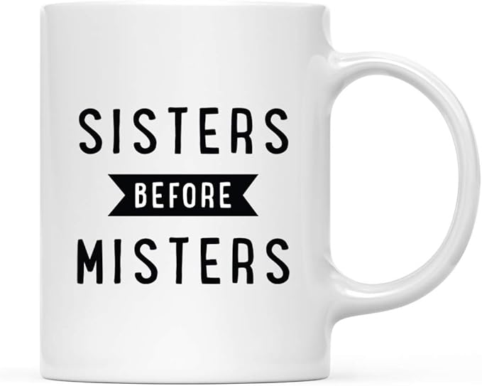 Andaz Press Valentine’s Day Funny 11oz. His Her Couples Coffee Mug Gift, Sisters Before Misters, 1-Pack, Gift Box