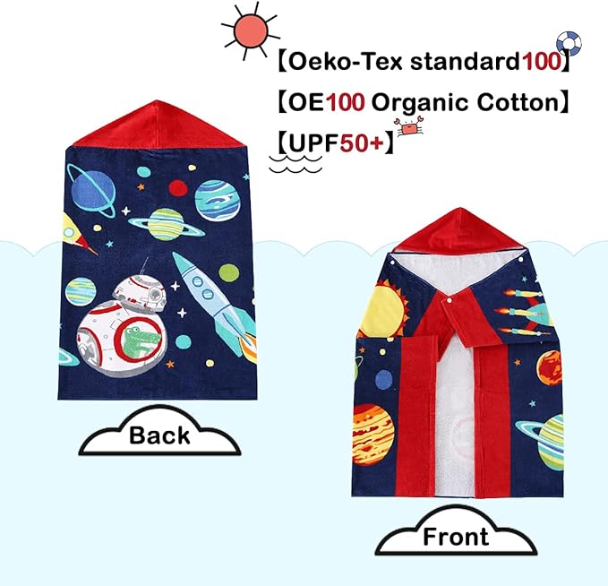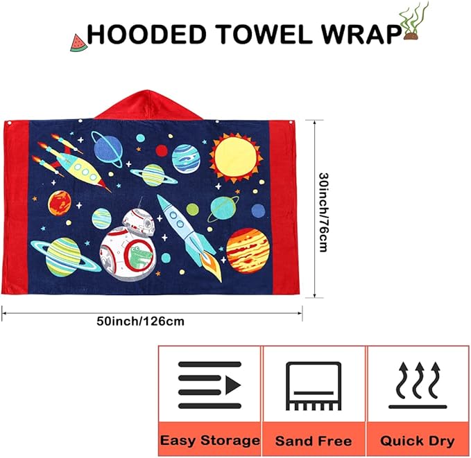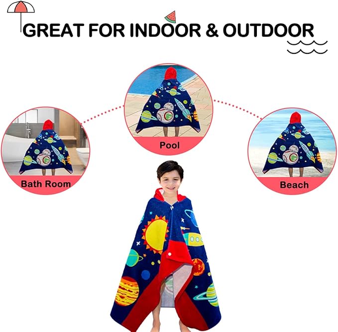 - ?Super Absorbent & Machine Washable??The beach towel for kids is extremely absorbent. The cotton bath towel will quickly absorb the moisture on kid's body surface to keep him warm. Avoid kids getting sick from the water. Make sure kids enjoy fun and safety with our hooded towels for kids. Washing method: Machine washable and gentle cycle.