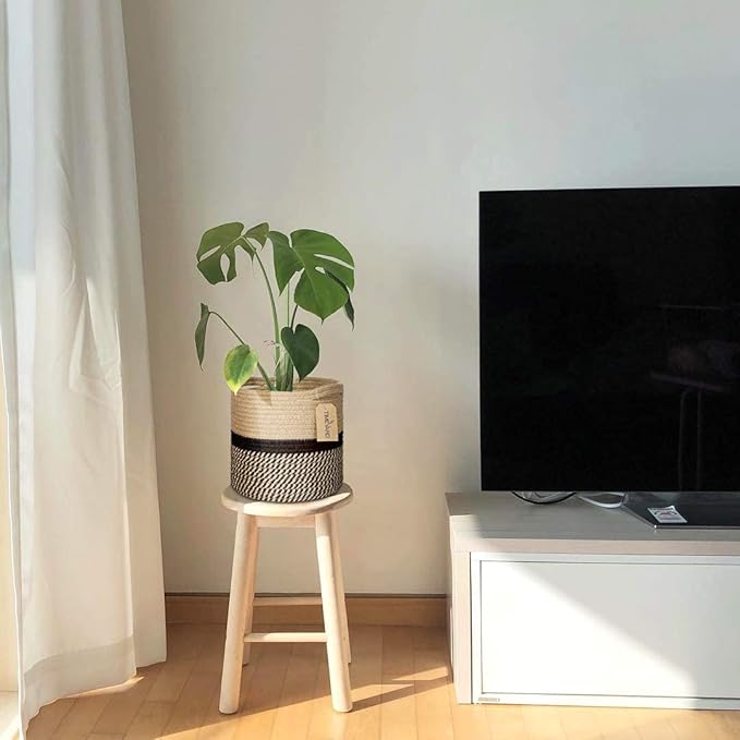 TIMEYARD Sturdy Jute Rope Plant Basket Modern Woven Basket up to 7.5 Inch Flower Pot Floor Indoor Planters, 8” x 8” Storage Organizer Baskets Rustic Home Decor, Black Stripes