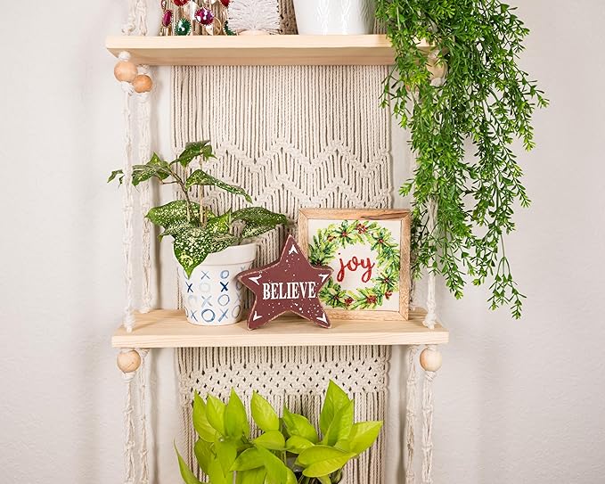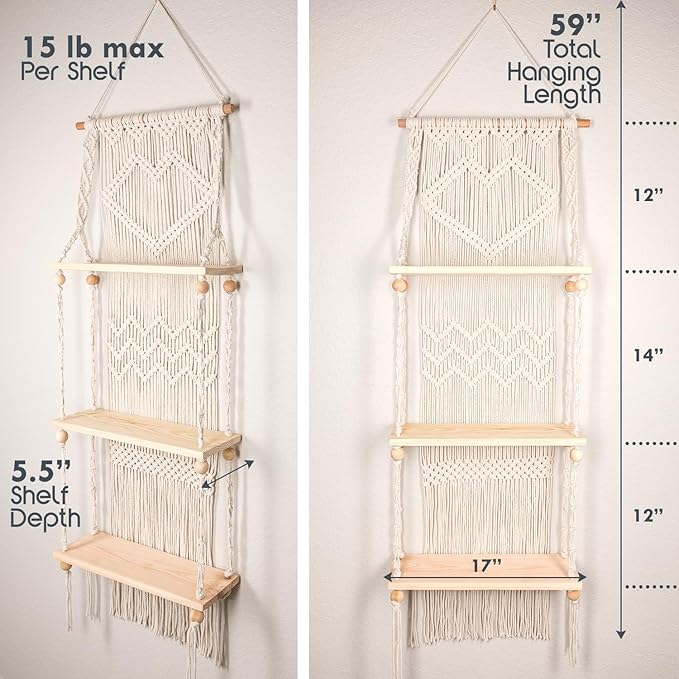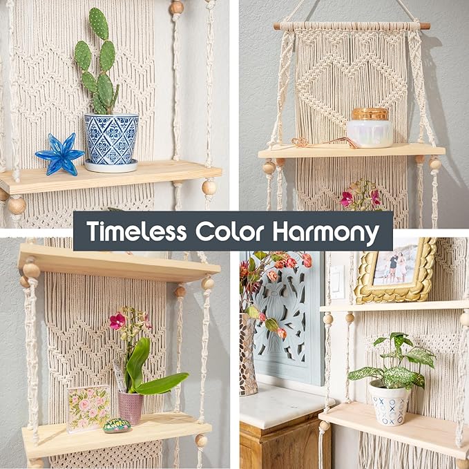 - SO MANY USES, so versatile. Our macrame shelf makes it easy to decorate any space. Beautiful hanging wall shelves for collectibles and photos, books in a dorm, office or a plant wall shelf display in the kitchen window